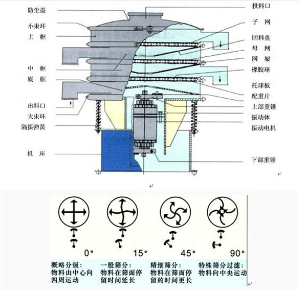 旋振篩是由直立式電機(jī)作激振源,電機(jī)上、下兩端安裝有偏心重錘,將電機(jī)的旋轉(zhuǎn)運(yùn)動(dòng)轉(zhuǎn)變?yōu)樗健⒋怪?、傾斜的三次元運(yùn)動(dòng),再把這個(gè)運(yùn)動(dòng)傳遞給篩面。通過調(diào)節(jié)上、下兩端的相位角,可以改變物料在篩面上的運(yùn)動(dòng)軌跡,通過增減振動(dòng)電機(jī)上下兩端的偏心重錘配重塊重量可以增加和減少震動(dòng)幅度。