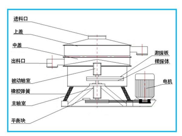 即可調(diào)節(jié)偏心距的激振器產(chǎn)生了非線性三維運(yùn)動(dòng),物料也產(chǎn)生同樣的近似手動(dòng)作業(yè)的運(yùn)動(dòng),從而達(dá)到篩分之目的,