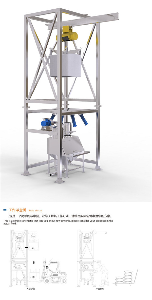 起重設(shè)備:自身攜的帶起重設(shè)備將大袋(噸袋)吊裝到卸料機的機架上,不需用外界的幫助。