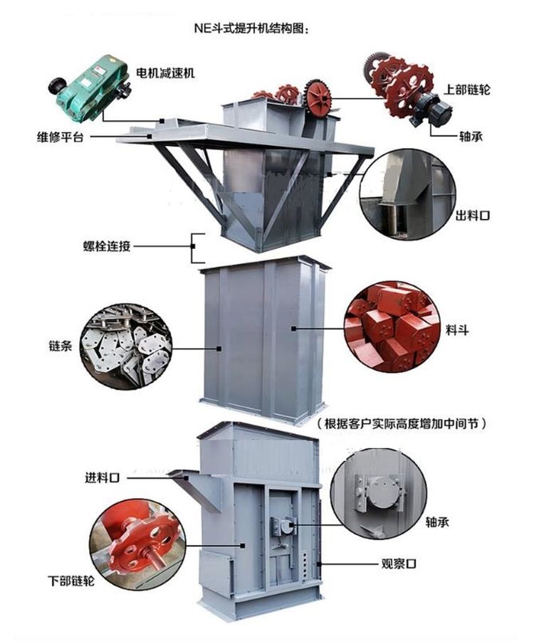 NE型板鏈?zhǔn)蕉肥教嵘龣C為板鏈?zhǔn)?、重力誘導(dǎo)卸料的提升設(shè)備。適用于垂直輸送粉狀、顆粒狀、小塊狀磨琢性或無磨琢性物料,如生料、水泥、煤、石灰石、干粘土、熟料等。