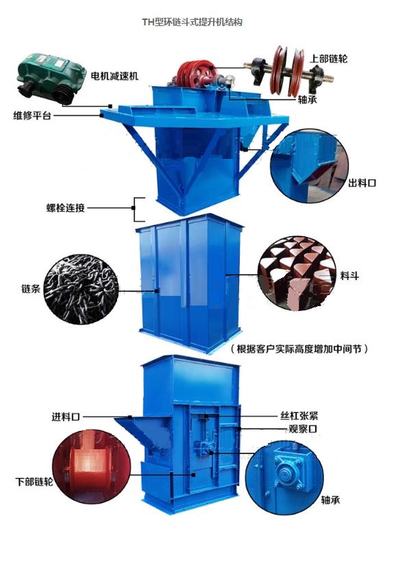 TH系列圓環(huán)鏈斗式提升機適用于輸送粉狀、粒狀及小塊狀的無磨琢及磨琢性小的物料。TH型環(huán)鏈?zhǔn)蕉肥教嵘龣C是一種圓環(huán)鏈斗式提升機采用混合式或重力卸料,挖取式裝料。TH型環(huán)鏈?zhǔn)蕉肥教嵘龣C適用于輸送堆積密度小于1.5t/m3易于掏取的粉狀、粒狀、小塊狀的底磨琢性物料。如煤、水泥、碎石、砂子、化肥、糧食等。TH型斗式提升機用于各種散狀物料的垂直輸送。適用于輸送粉狀、粒狀、小塊狀物料,物料溫度在250℃以下。