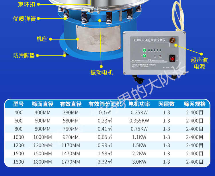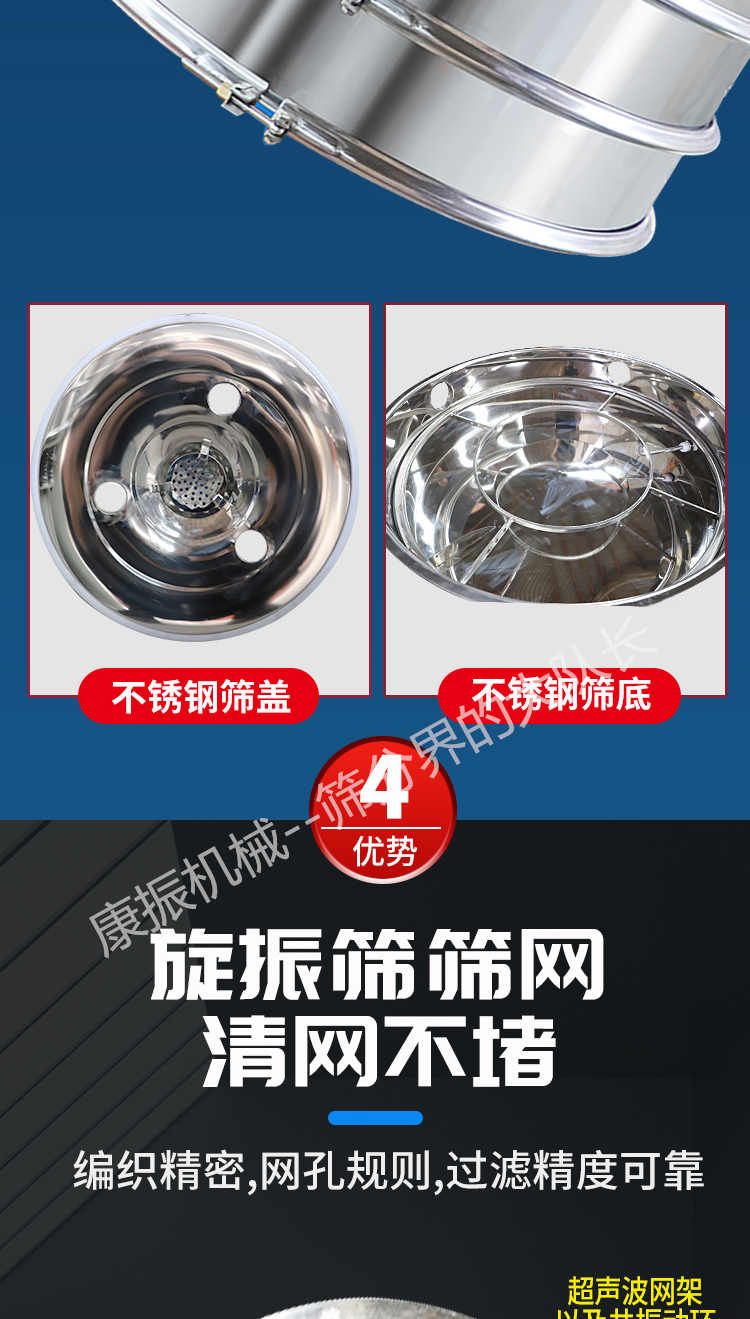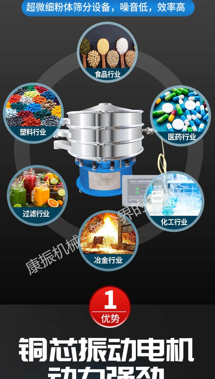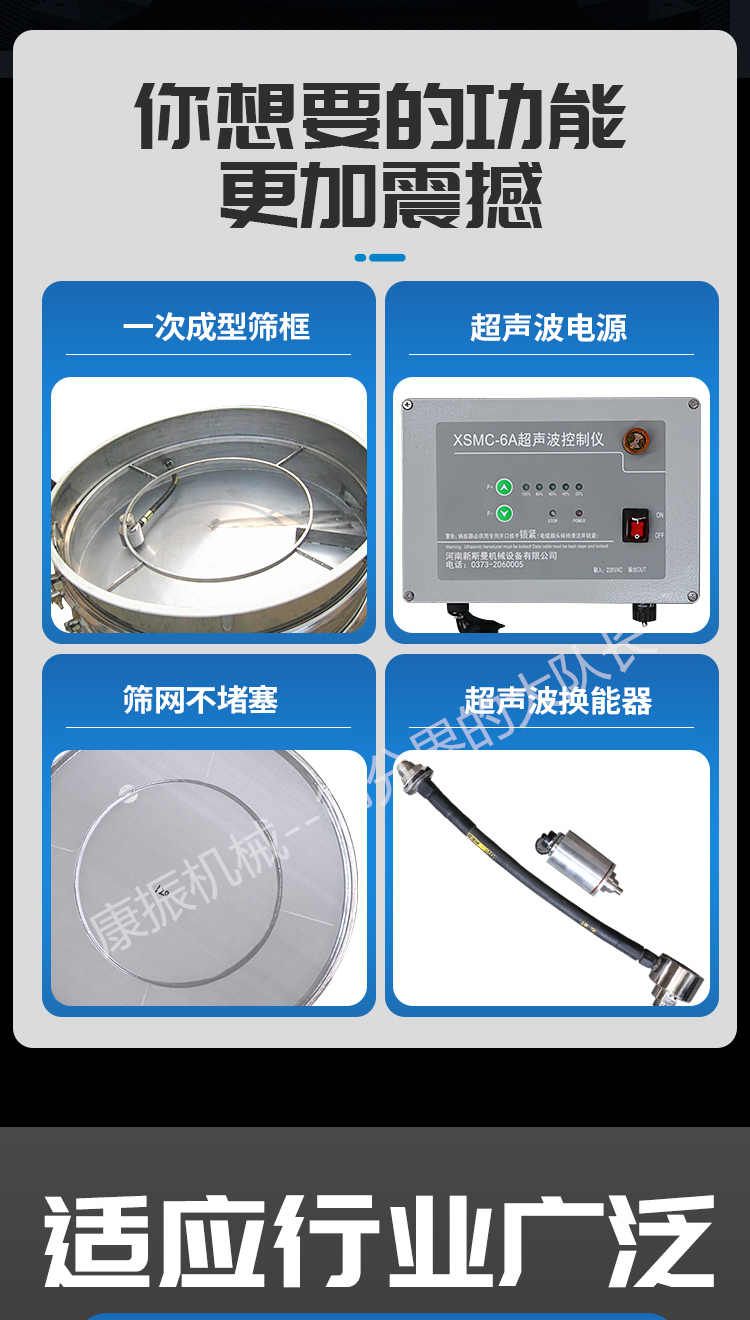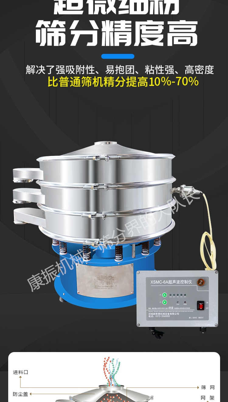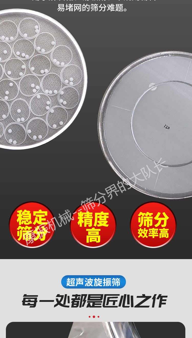 超聲波振動篩是在旋振篩的基礎上引入了超聲波清網裝置,通過將220V、50Hz或110V、60Hz電能轉化為18KHz的高頻電能,輸入超聲換能器,將其變成18KHz機械振動,從而達到高篩分和迅速清網的目的,使超微細粉篩分成為易事。該系統(tǒng)在傳統(tǒng)的振動篩基礎上在篩網上引入一個低振幅、高頻率的超聲振動波(機械波),以改善超微細粉體的篩分性能。特別適合高附加值精細粉體的用戶使用。超聲波篩分系統(tǒng)是一種簡單實用、可靠的篩分系統(tǒng),是當前網孔堵塞的有效的解決方法。可廣泛應用于制藥、冶金、化工、選礦、食品等要求精細篩分過濾的行業(yè),篩分過濾精度高,有效解決因團聚、靜電、強吸附性卡堵網孔等篩分難題,是國內篩分行業(yè)的一項重大技術突破。