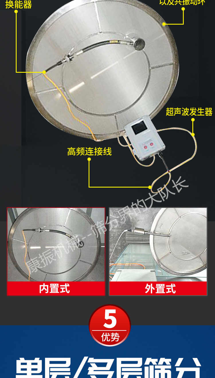 超聲波篩分系統(tǒng)由超聲波諧振電源、振蕩器、共振環(huán)組成。超聲波諧振電源產生的高頻電振蕩由振蕩器轉換成高頻正弦形式的縱向振蕩波,這些振蕩波傳到共振環(huán)上使共振環(huán)產生共振,然后由共振環(huán)將振動均勻傳輸至篩面。篩網上的物料在做低頻三次元振動的同時,疊加上超聲波振動,既可防止網孔堵塞,又可提高篩分產量和質量。