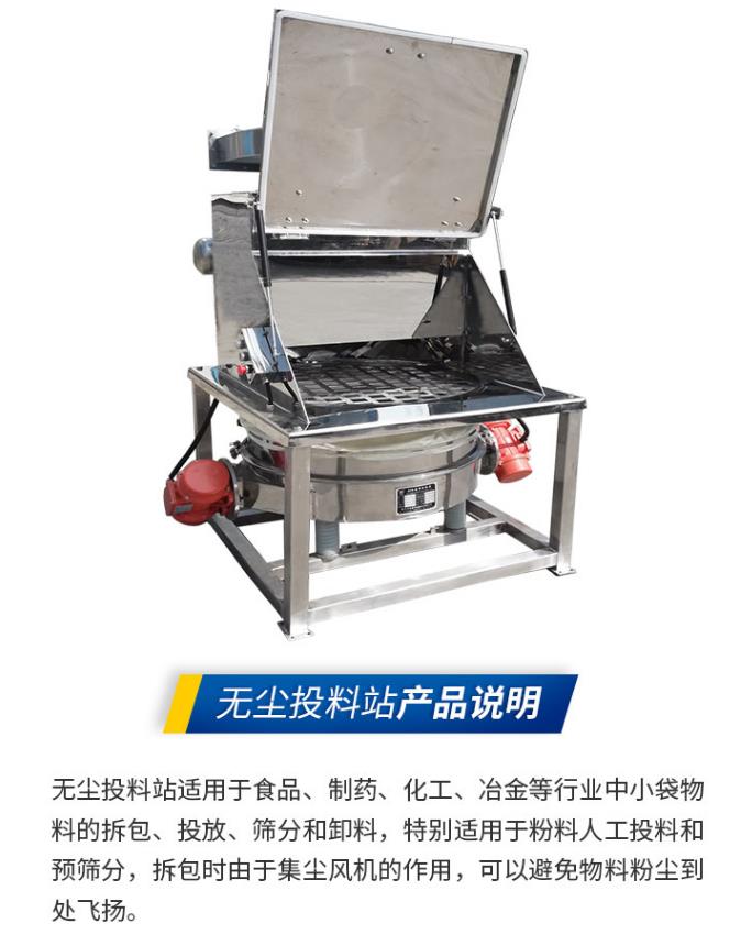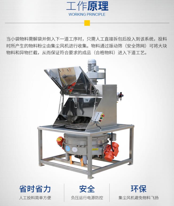 當小袋物料需要解袋并倒入下一道工序時,只需人工直接拆包后投入到該系統(tǒng),投料時所產(chǎn)生的物料粉塵由集塵風機進行收集。物料通過安全篩網(wǎng)可將大塊物料和異物攔截,從而保證符合要求的顆粒排出。該系統(tǒng)適用于制藥、化工、食品行業(yè)中小袋物的投放、篩分和卸料,特別適用于針對流動性較差物料的投料和篩分,拆包時由于集塵風機的作用,可以避免物料粉塵到處飛揚。