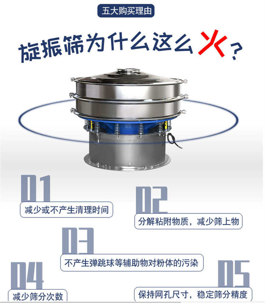 篩選范圍廣--只有系列三次元旋振篩能分選如此廣的原料范圍:任何顆粒、細粉、漿液都可以篩選。篩分細500目(28微米),過濾細5微米。網(wǎng)孔防堵塞--三次元振動功能及自動清理堵網(wǎng)裝置把堵網(wǎng)幾率降到小。 單層或多層分選--每臺旋振篩可選一至五層篩網(wǎng),能同時進行二到六個等級的分選或過濾。