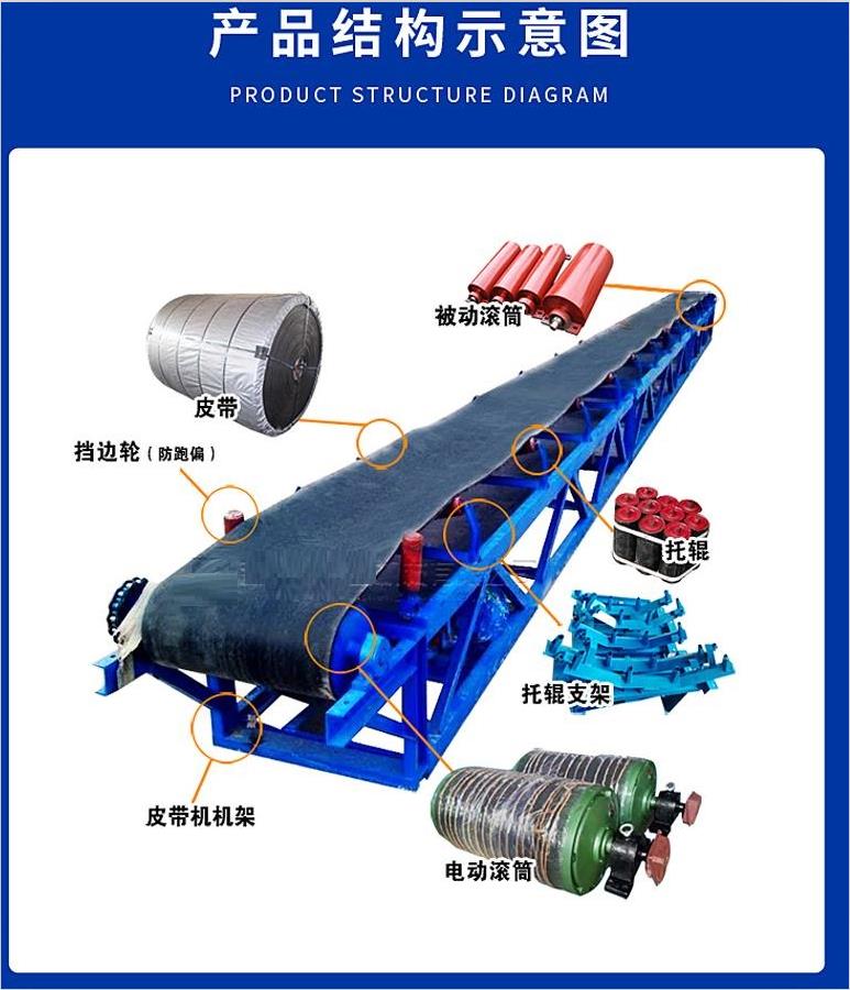 物料及袋裝物料,如煤、碎石、砂、水泥、化肥、糧食等。被送物料溫度小于60℃。其機(jī)長(zhǎng)及裝配形式可根據(jù)用戶(hù)要求確定,傳動(dòng)可用電滾筒,也可用帶驅(qū)動(dòng)架的驅(qū)動(dòng)裝置。