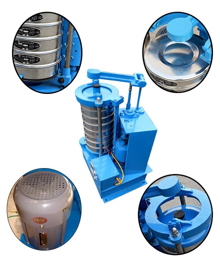 電機(jī)帶動齒輪通過同步帶傳動到主軸上,經(jīng)齒輪變速后主軸按要求的轉(zhuǎn)速轉(zhuǎn)動,主軸帶動偏心輪使滑板做往復(fù)運(yùn)動,帶動安裝在滑板托盤中的試驗(yàn)篩左右搖動,同時(shí)主軸帶動頂桿齒輪轉(zhuǎn)動,變速后頂桿齒輪通過凸輪頂擊頂桿,頂桿使拍錘上下拍擊試驗(yàn)篩上蓋,使得試驗(yàn)篩、分樣篩中的物料往復(fù)和上下振動,使小于試驗(yàn)篩的篩面網(wǎng)孔的物料顆粒篩分進(jìn)下層試驗(yàn)篩,如此層層篩選,使每層試驗(yàn)篩內(nèi)只留相同粒度的物料。達(dá)到不同粒度的分離并確定此物料的粒度組成。